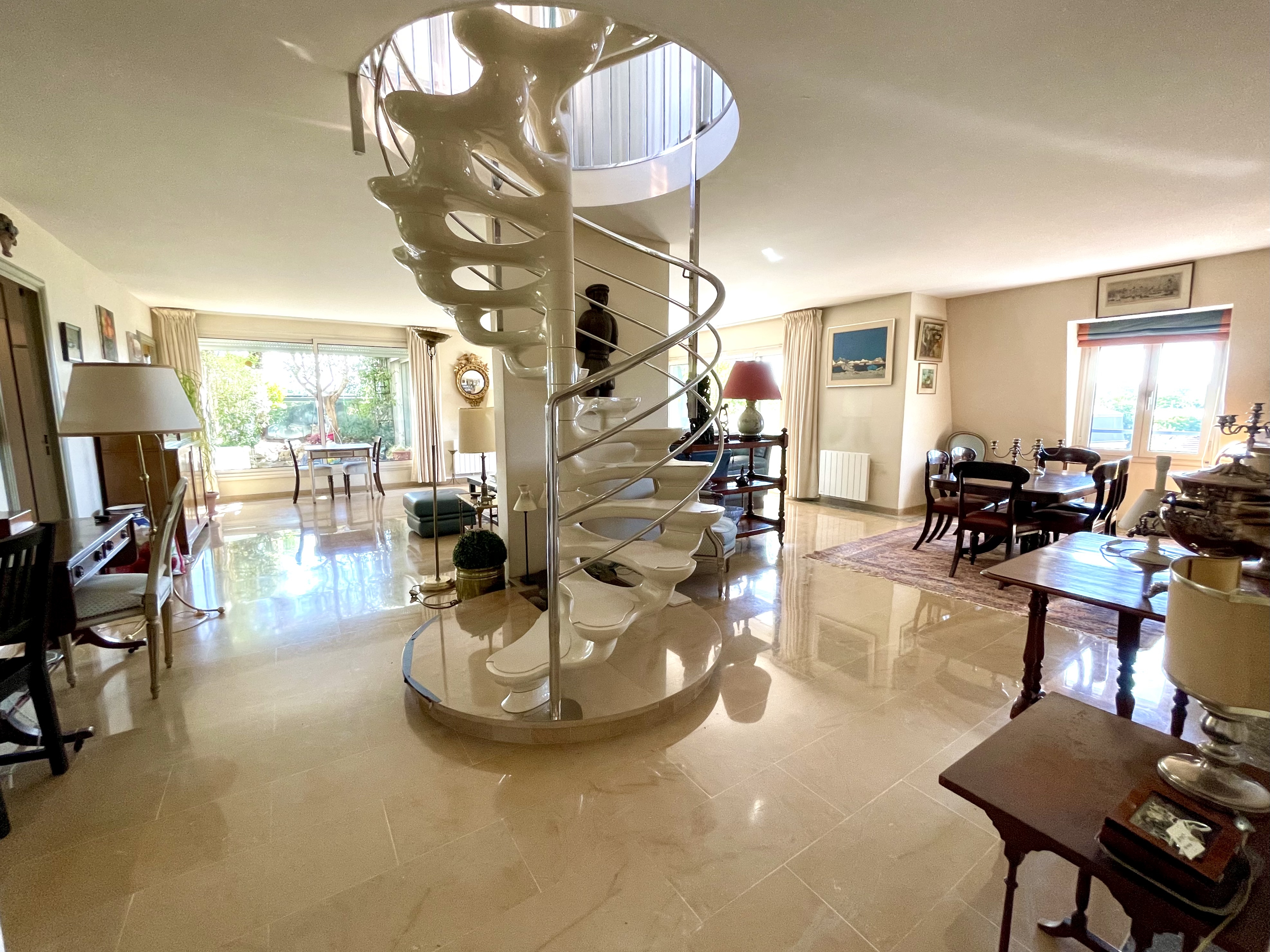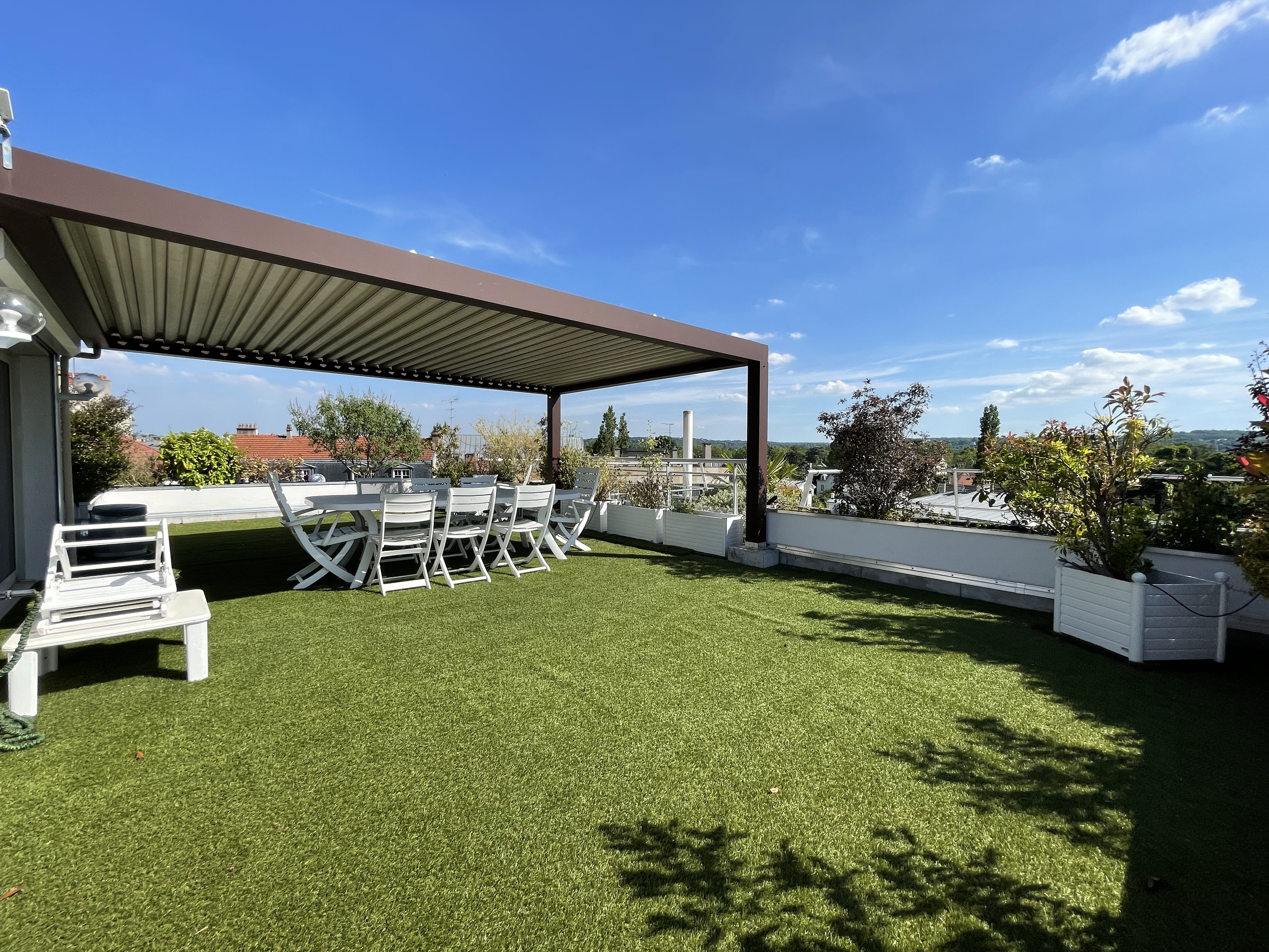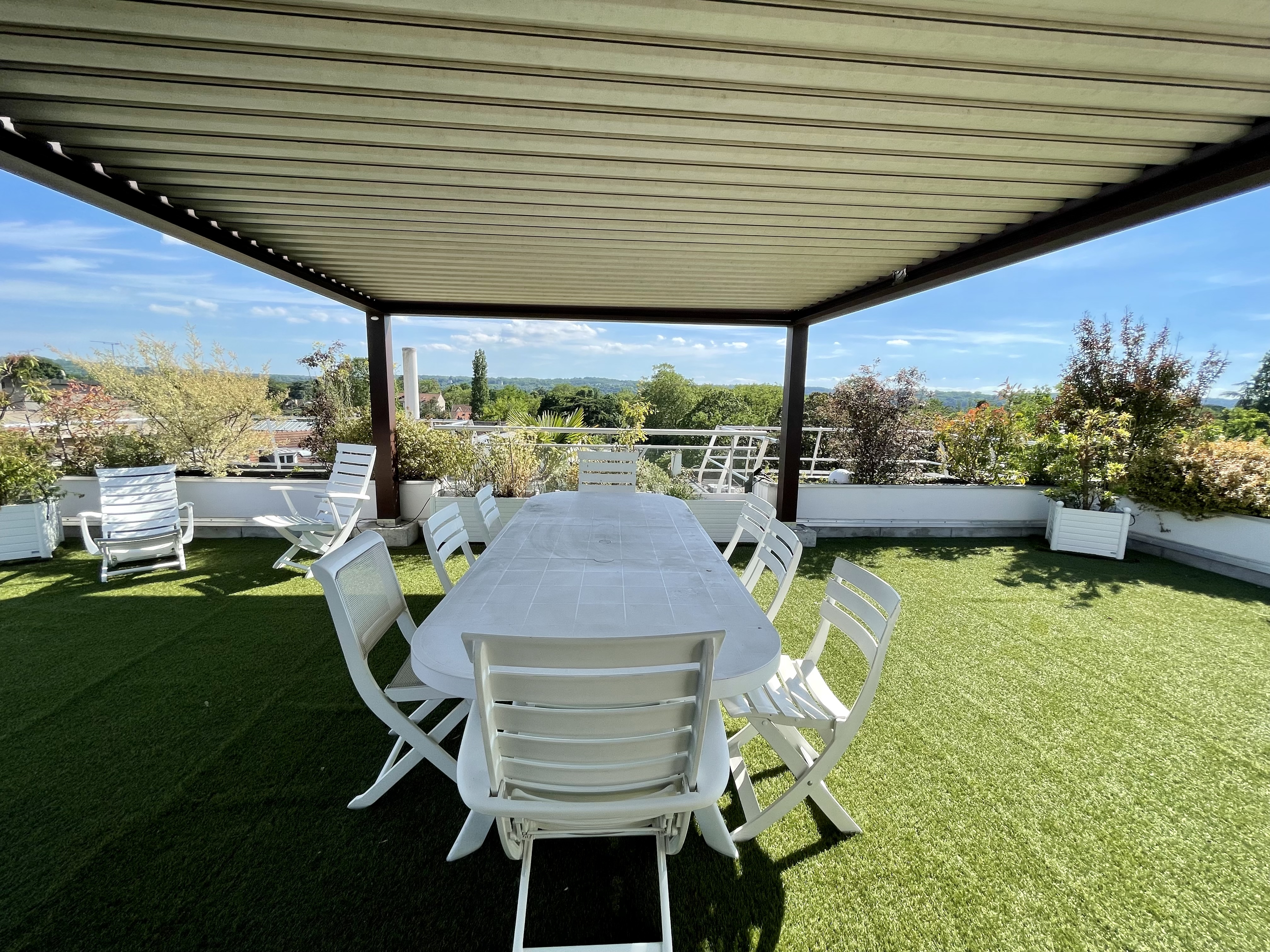 A quelques minutes à pied du RER Vésinet Centre et à proximité immédiate de la place du marché, situé en dernier étage d'un immeuble récent de grand standing, exceptionnel et unique appartement en duplex de 173m2 + 100 m2 de terrasses et balcons avec vue imprenable à 180 degrés. Appartement comprenant une entrée avec wc, grand dressing (ou bureau de 10m2), très belle réception 80m2 exposée sud et ouest sur patio et balcon, cuisine entièrement aménagée et équipée de 15 m2, 2 chambres en suite de 24 et 29 m2 (avec chacune salle de bains et wc), très bel escalier accédant à un espace couvert donnant sur une superbe terrasse de 55 m2 sans aucun vis-à-vis, espace repas sous une pergola électrique. 2 parkings (sous-sol et extérieur) et une cave complètent ce bien extrêmement rare.