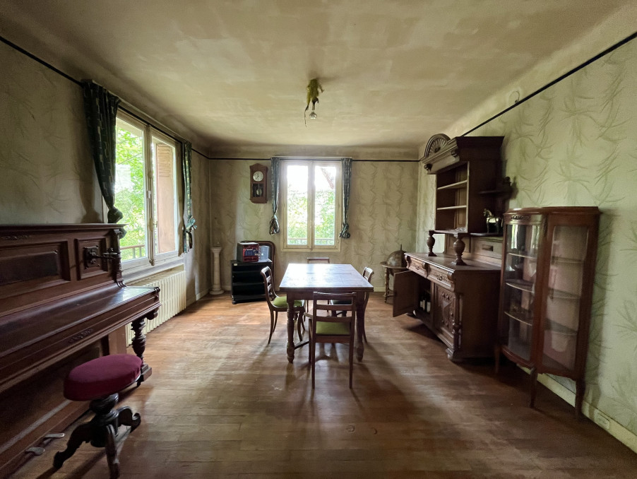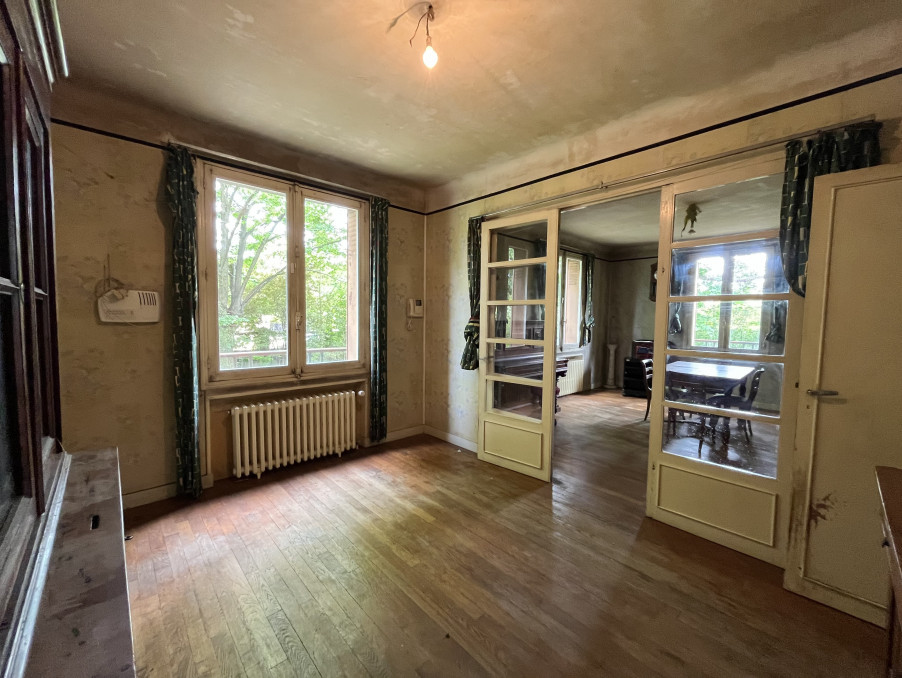 cette maison à rénover de 160 m2 comprend au rez-de-chaussée une belle entrée desservant un double séjour de 33 m2, cuisine de 16 m2 avec accès sur une petite véranda, wc indépendant.